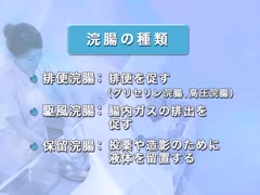 浣腸・摘便前のアセスメント、排便浣腸の援助(浣腸実施の留意点、環境整備、基本体位、浣腸液の適温、チューブ挿入方法、浣腸液の注入方法、排便後のケア、便の観察など)、高圧浣腸の援助、摘便の援助(環境整備、指の挿入方法、直腸内での指の動かし方など)