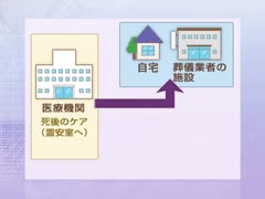 死体の経時変化、死に関する法律、病理解剖を受ける場合、遺体処置用品(エンゼルメイク、ケア用品)、伝統的な死後のケア(湯灌、詰め物、整容、死化粧など)